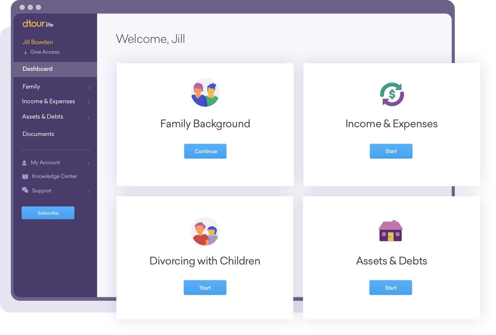 Unlike most legal technology, dtour.life is NOT a per seat charge, it is a per Case charge. 1 person pays ($5-$8 per Case/per month) with complimentary access for anyone else added to the Case. This makes it far more cost effective for the team. The dtour.life platform is designed to assist you in working with clients by allowing all stakeholders, including your internal staff and outside experts, to organize, manage and analyze the data, reports and documents required throughout the process. When the case is concluded, you are leaving your clients in a better position to move forward with all of their financials, reports and next steps for their post-divorce chapter. We also offer payment flexibility for situations where perhaps a client subscribed before hiring you, then you can easily switch them onto your plan. When the case is concluded, your client can take over ownership to have access to all of their financial data. Or, if passing it on to another stakeholder, you can transfer ownership in 1 click.