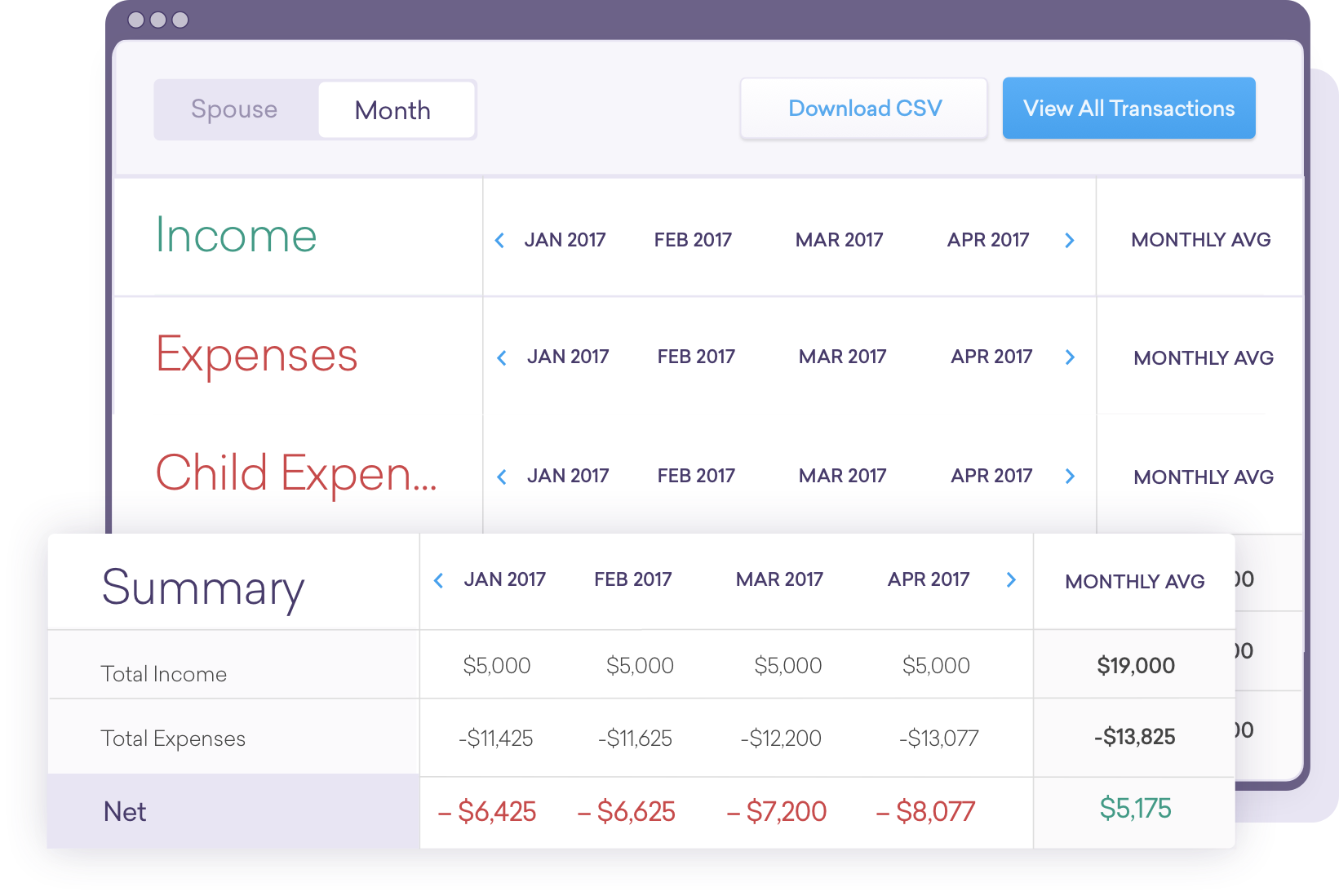 Client-facing on boarding, workflow and document management for easy input of all data throughout the life of the case. Digital dashboard gives clients tools for better case management, so you get what you need accurately and faster. Case settled? Leave your clients with everything they need to move forward with post-divorce management. Easily switch payor to the client with one click.